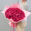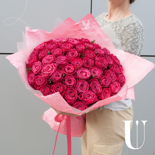 Монобукет состоит из 51 ярко-малиновой розы, что делает его ярким и запоминающимся. Розы собраны на стеблях, что придает букету естественный и натуральный вид.