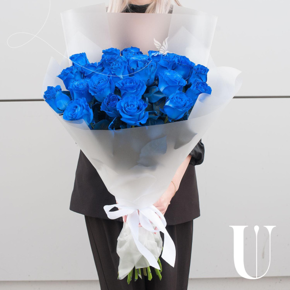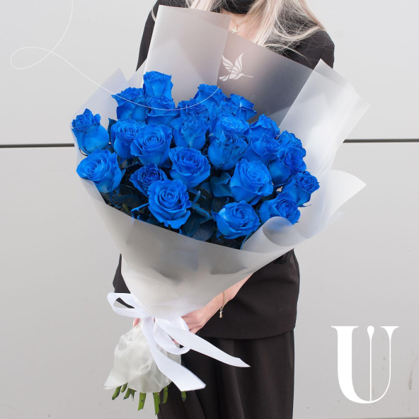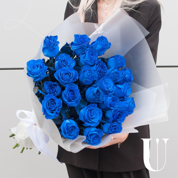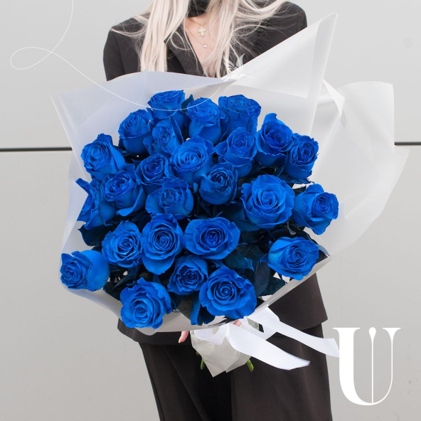 Букет состоит из 23 синих роз, которые собраны на стеблях и оформлены в пленку. Такой подход позволяет цветам дольше сохранять свежесть и красоту.