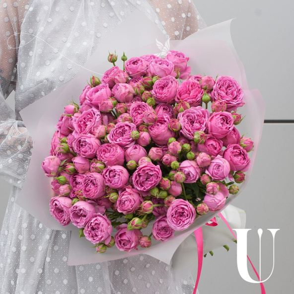 Букет состоит из 19 кустовых пионовидных роз розового цвета, что делает его ярким и запоминающимся. Розы - символ любви и нежности, поэтому такой букет будет приятным сюрпризом для любого человека.