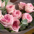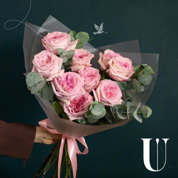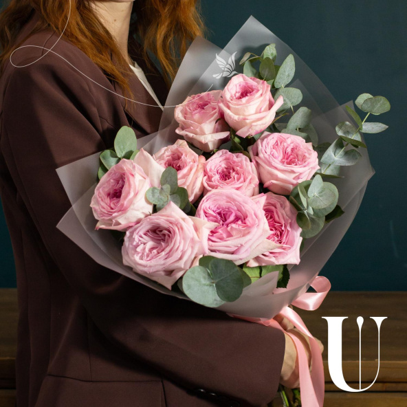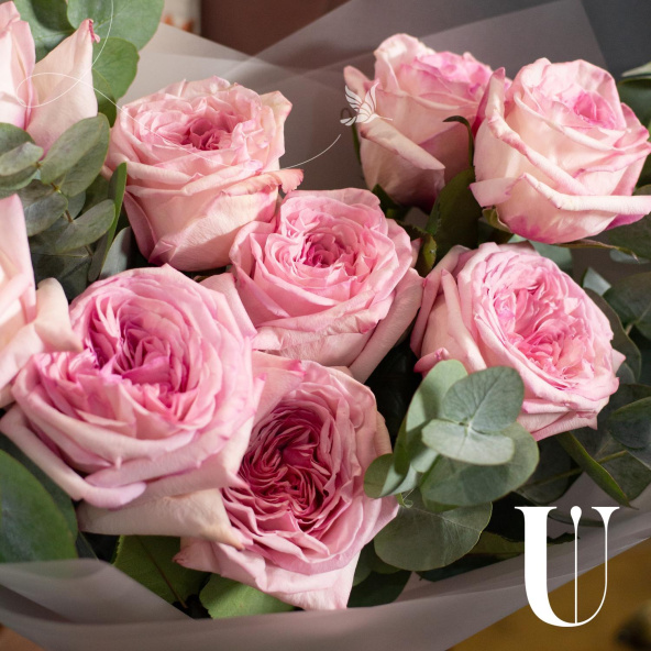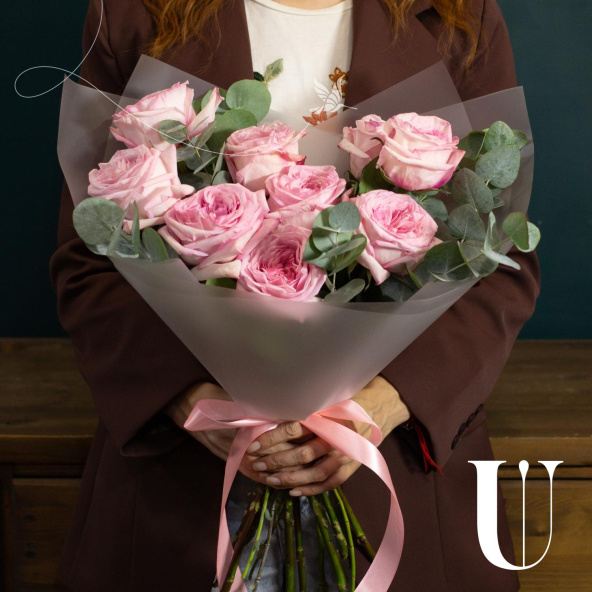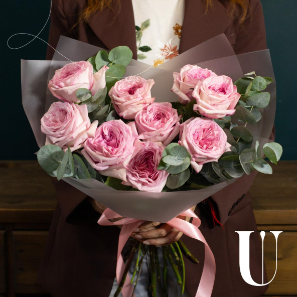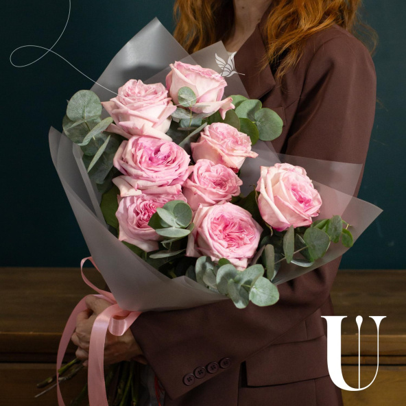 Монобукет из 9 роз сорта Пинк Охара в дизайнерской упаковке