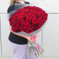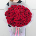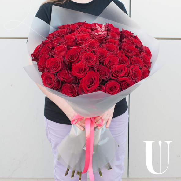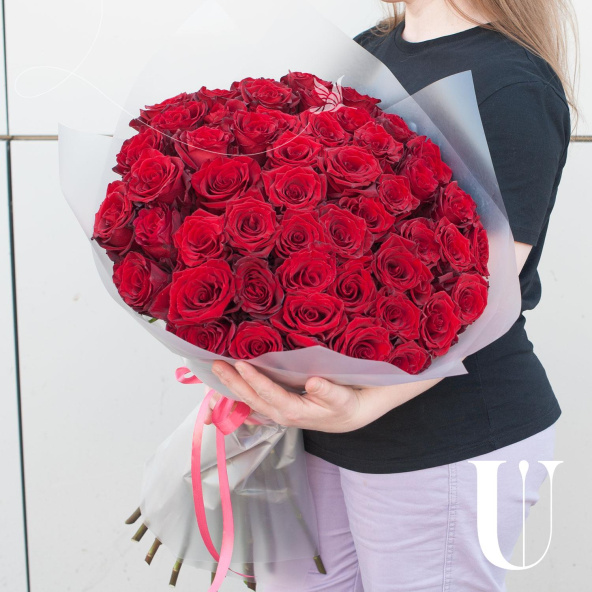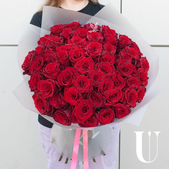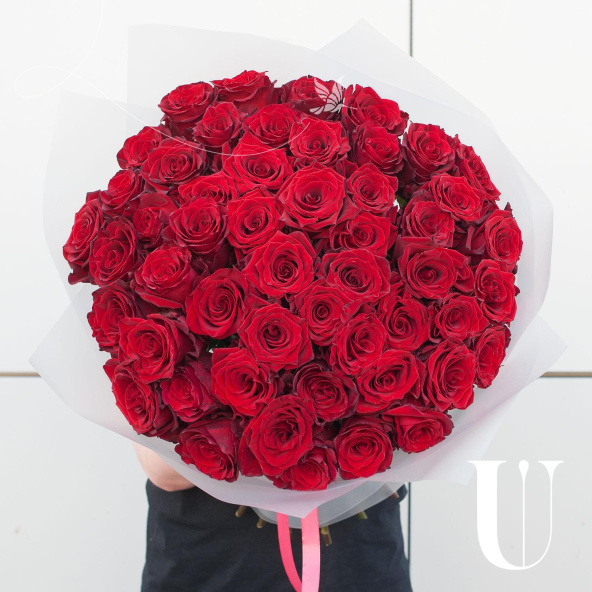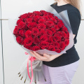 Букет состоит из 51 эквадорской красной розы высотой 70 см, что придает ему особую пышность и объем. Розы собраны на стеблях, что позволяет им сохранять свою форму и свежесть на протяжении долгого времени.