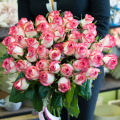 Монобукет из 19 роз сорта Пинк Охара 50 см в розовой упаковке