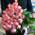 Монобукет из розовых кустовых роз и ромашки в упаковке