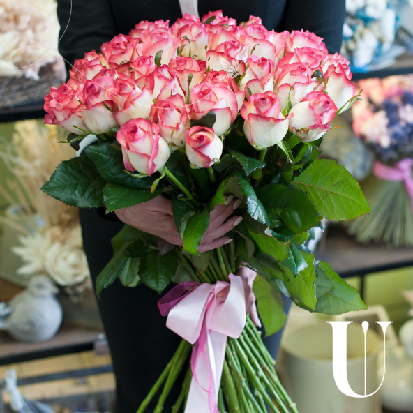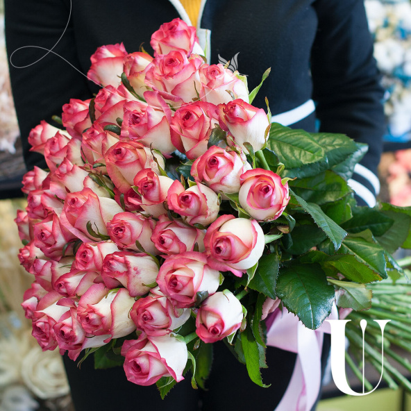 Монобукет из 51 розы Ред Наоми в розовой упаковке