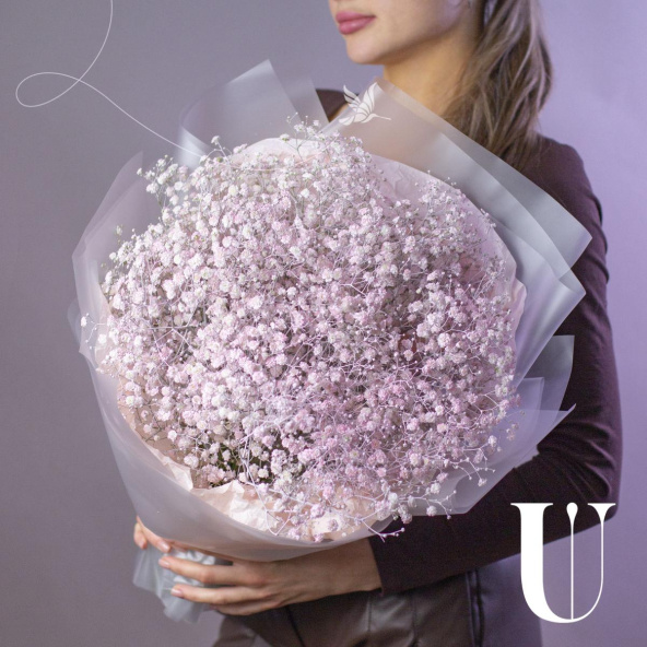 Монобукет из нежно-розовых кустовых пионовидных роз в упаковке