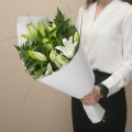 Букет из белых кустовых пионовидных роз сорта Бомбастик в упаковке