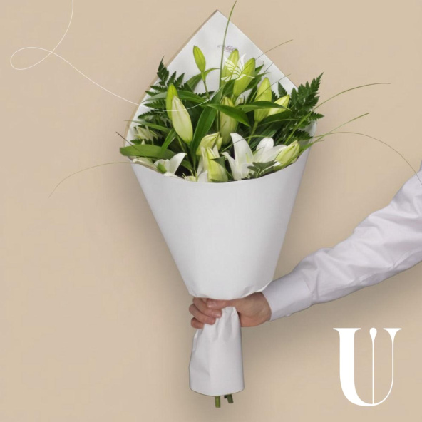 Монобукет из 5 розовых лилий в дизайнерской упаковке