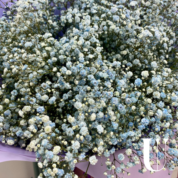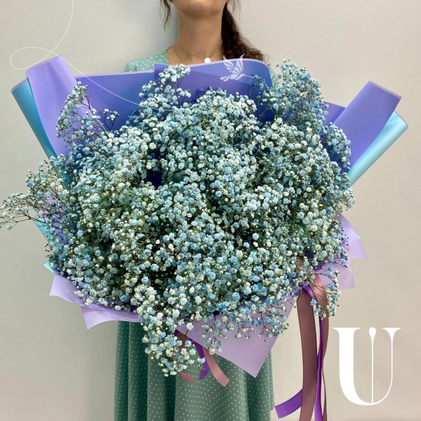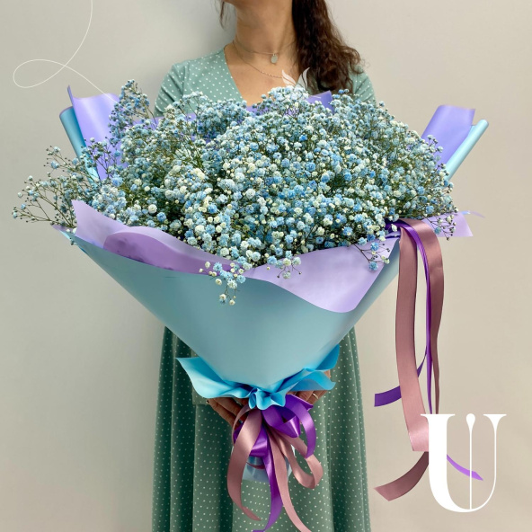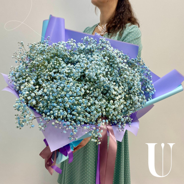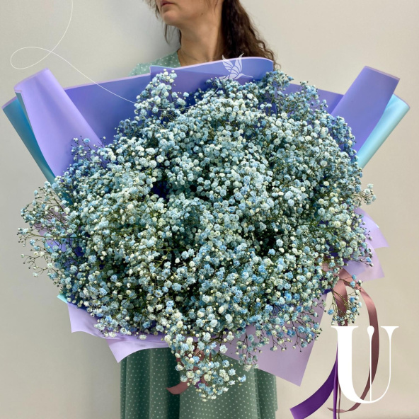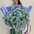 Букет из белой гипсофилы и игрушки в красной упаковке