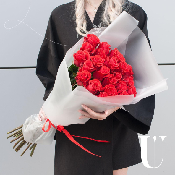 Букет состоит из 25 эквадорских алых роз премиум класса, что гарантирует их высокое качество и великолепный вид.