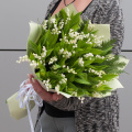Букет состоит из 49 белоснежных ландышей, которые символизируют чистоту и свежесть. Зелень амбрелла добавляет композиции легкости и воздушности.