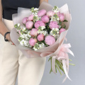 Монобукет из 19 розовых ранункулюсов в голубой упаковке