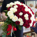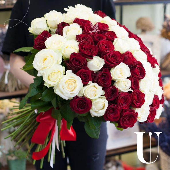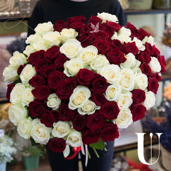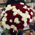 Монобукет из 75 розовых и белых роз в крафтовой упаковке