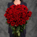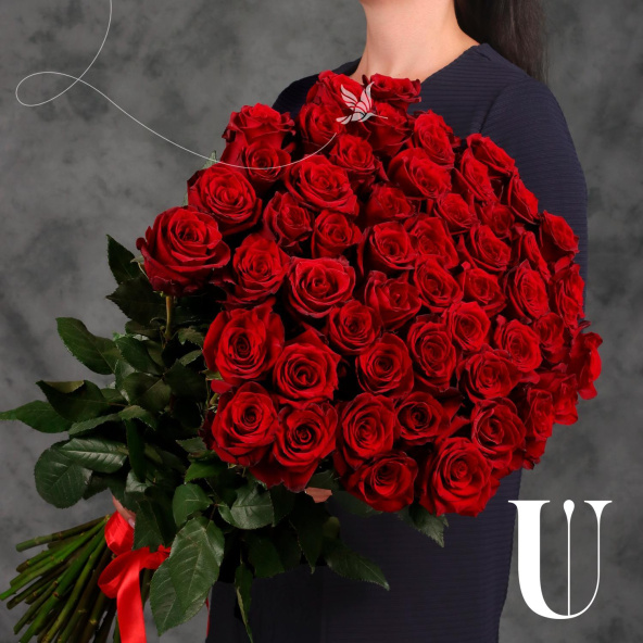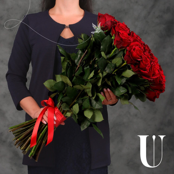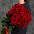 Большой букет из роз Ред Наоми, Аваланж и Аква в красной упаковке
