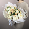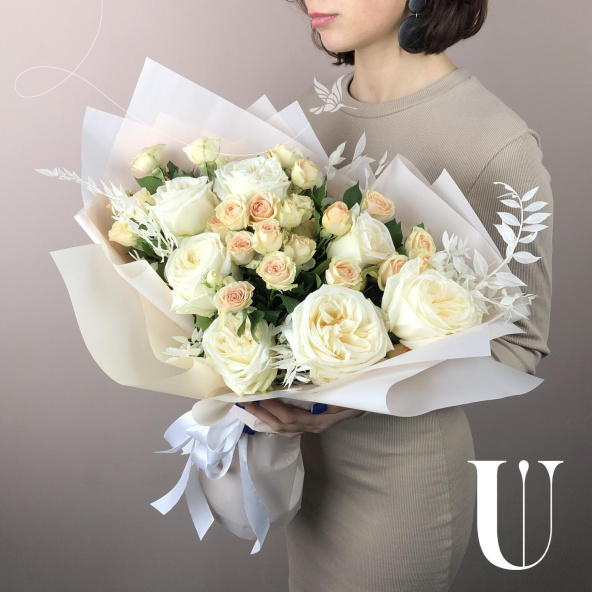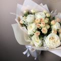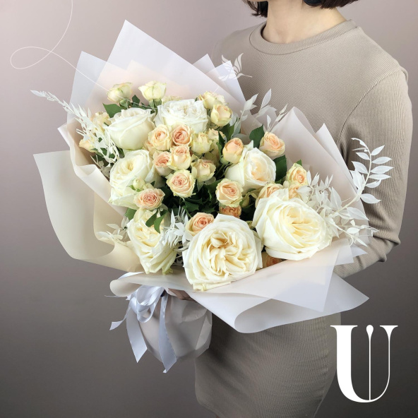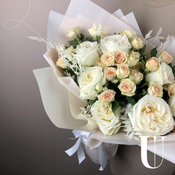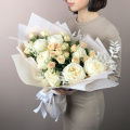 Букет из кустовых роз Лидия и роз Аваланж в дизайнерской упаковке