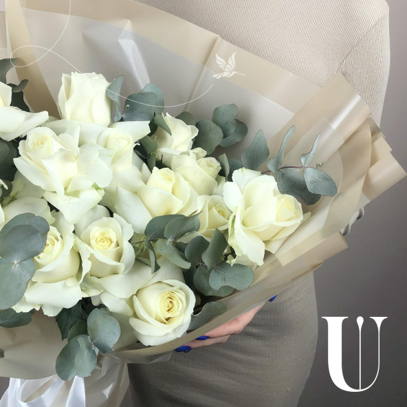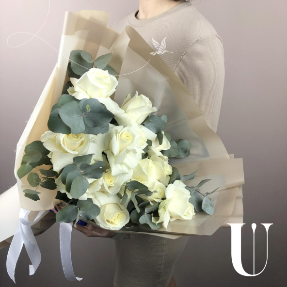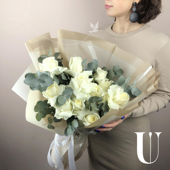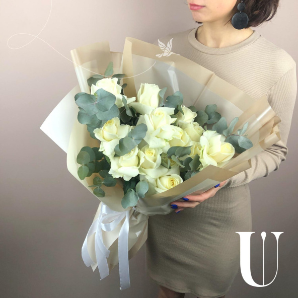 Утонченное сочетание розы и эвкалипта несомненно подарит получателю хорошее настроение