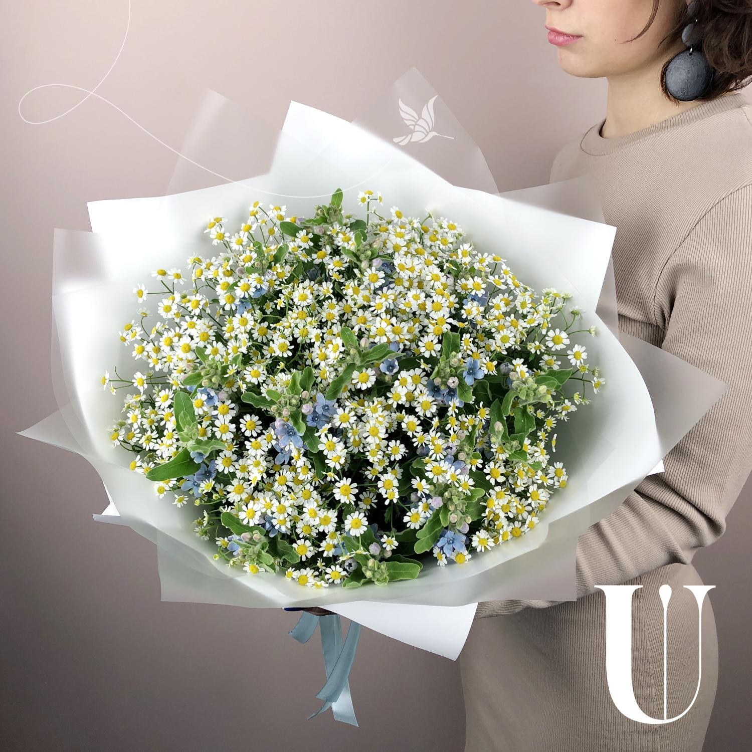 Монобукет из ромашки Камилла и голубого оксипеталума