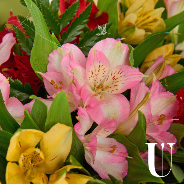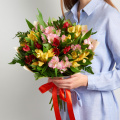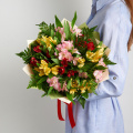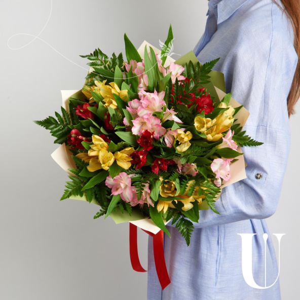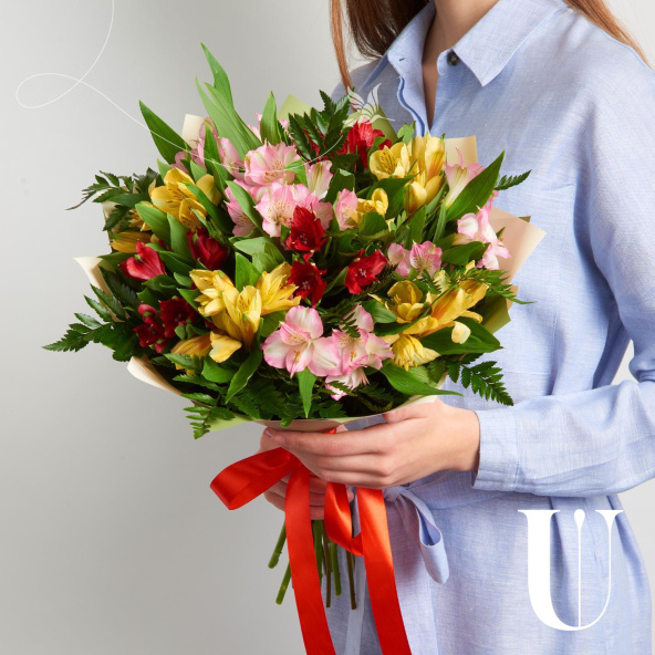 Монобукет из 15 альстромерий с зеленью в крафтовой упаковке