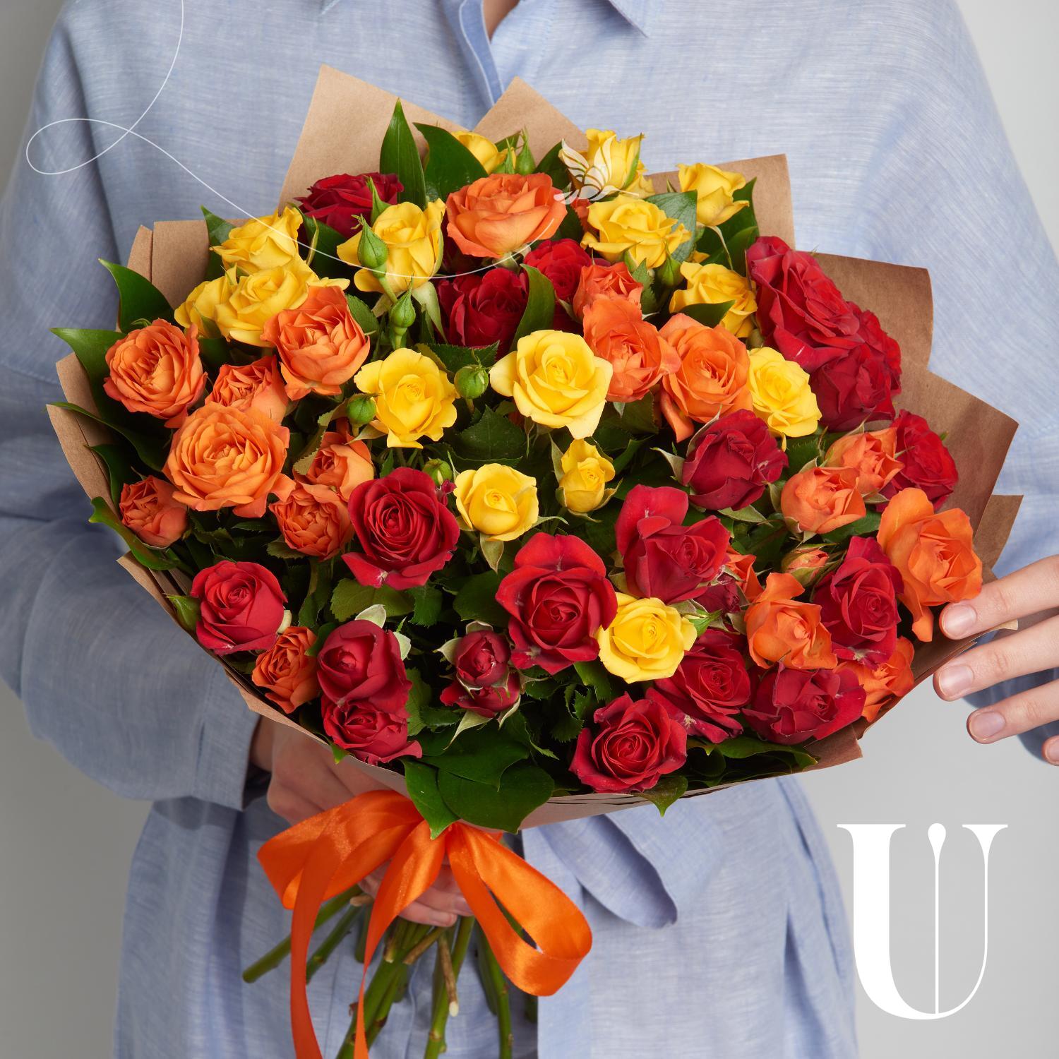 Монокомпозиция из кустовых роз в дизайнерской упаковке
