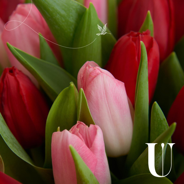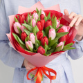 Монобукет из розовых и белых тюльпанов в упаковке