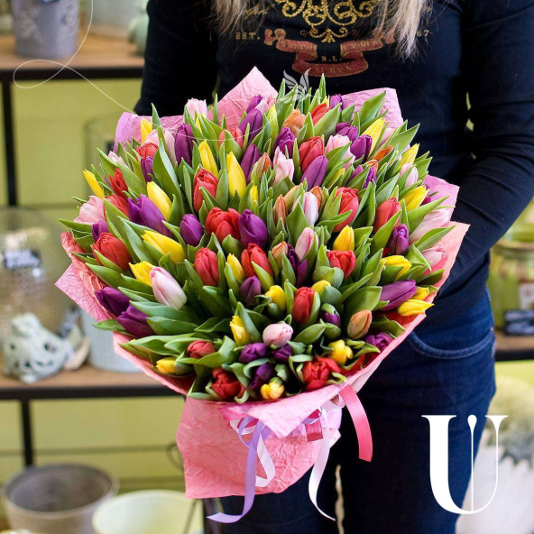 Букет из тюльпанов сорта Сара Бернар и малиновых тюльпанов в упаковке