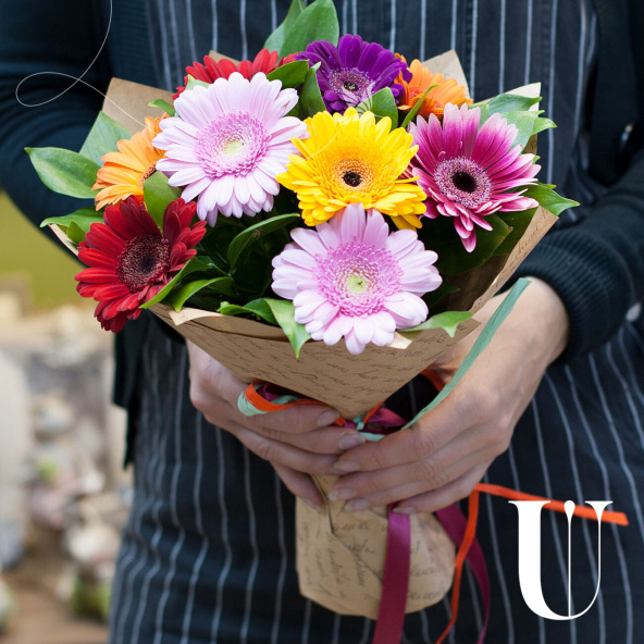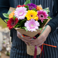 Монобукет из 9 разноцветных гербер в оливковой упаковке