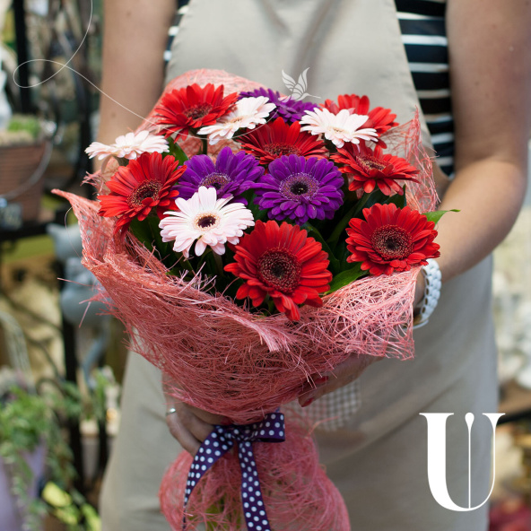 Букет из 15 разноцветных гербер в крафте