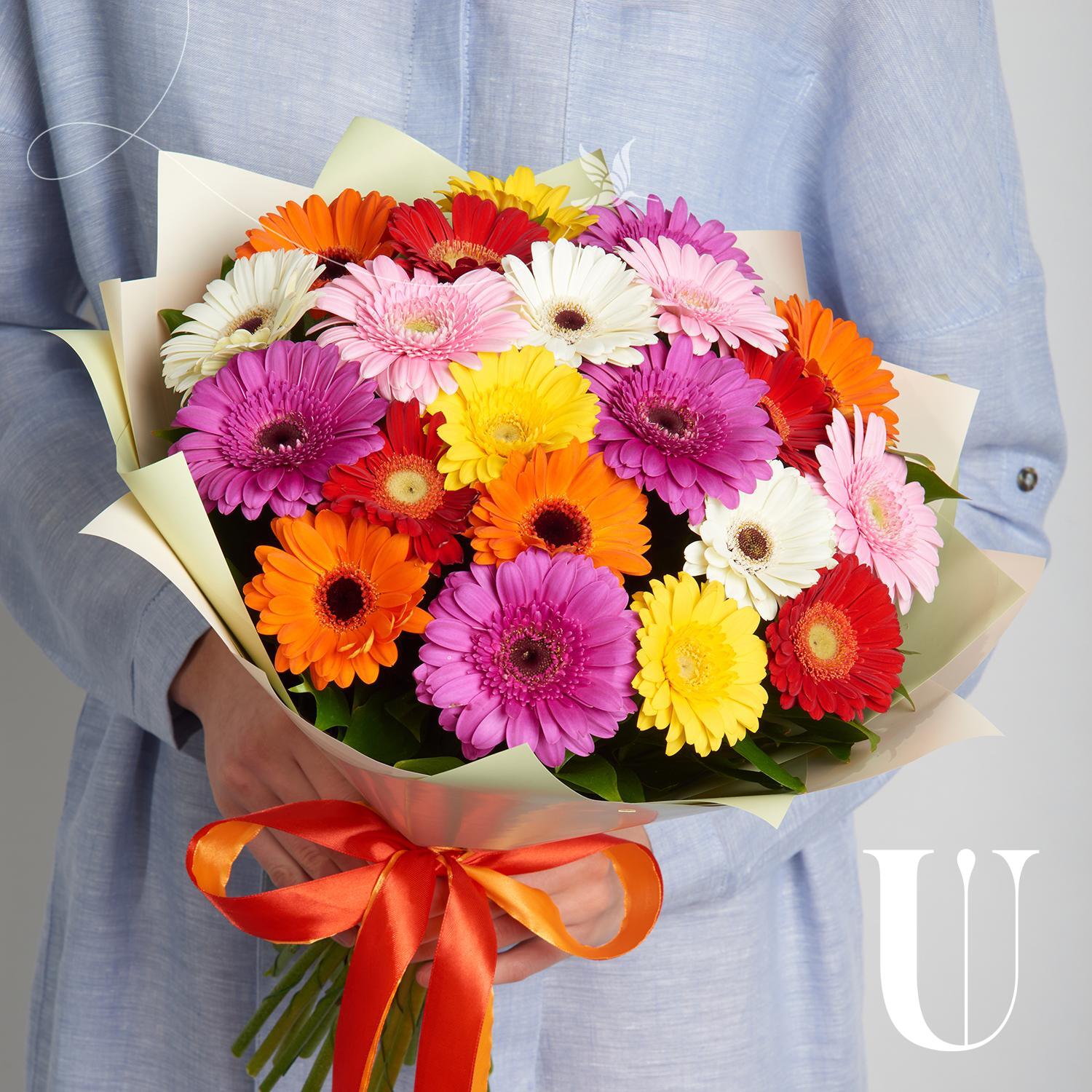 Монобукет из желтых гербер и эвкалипта в упаковке
