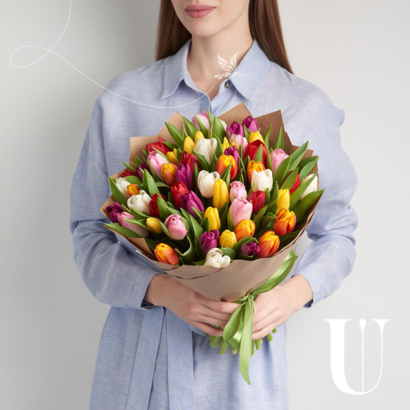Монобукет из 29 желтых тюльпанов и бирюзового лагуруса в крафтовой упаковке