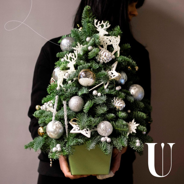 Собранная новогодняя ель из нобилиса и декора в кашпо
