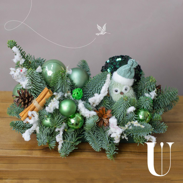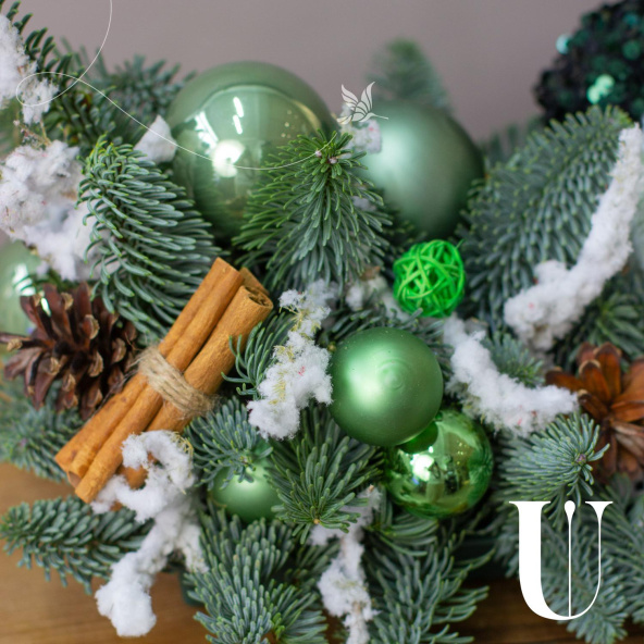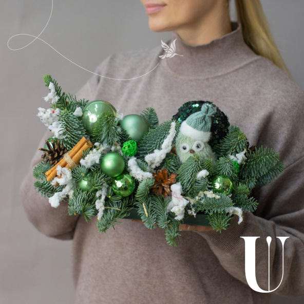 Зимняя композиция из нобилиса и шаров в белом ящике