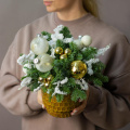 Новогодняя композиция из нобилиса, туи и декора в белом ящике