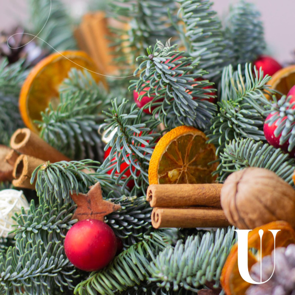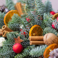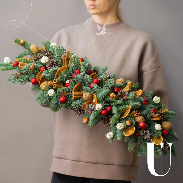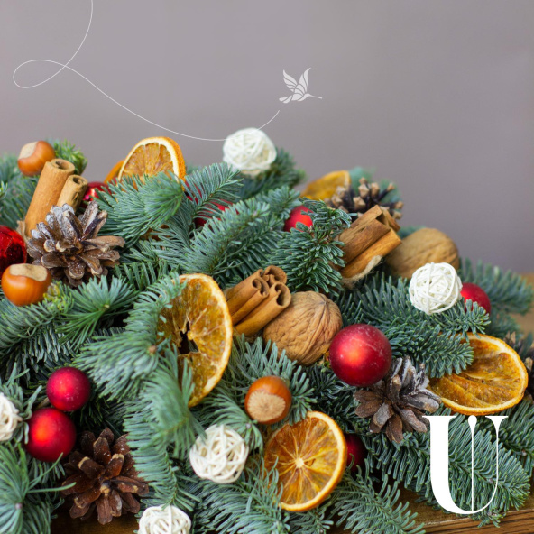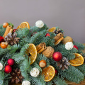 Состав: Нобилис - 1, апельсин дольки - 24 шт, орех грецкий - 9 шт, фундук - 10 шт, шар красный стекло 3,5 см - 3 шт, шар красный стекло 2 см - 27 шт, шар пластик красный 3 см - 5 шт, корица - 30 шт, шишка - 15 шт ,шар плетеный красный и белый - 16 шт.