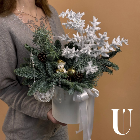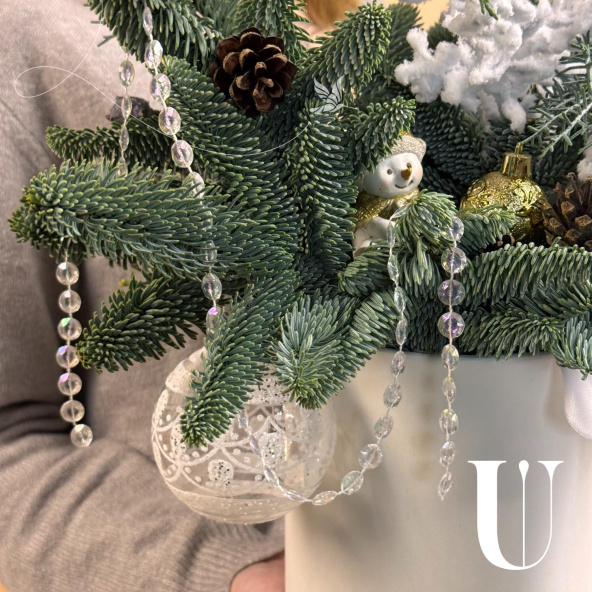 Новогодняя композиция «Морозный лес» — это настоящее произведение искусства, созданное для того, чтобы наполнить ваш дом атмосферой праздника и волшебства. В этой композиции сочетаются изысканность нобилиса, нежность голубого кипариса, забавный снеговичок и яркие новогодние шары.
