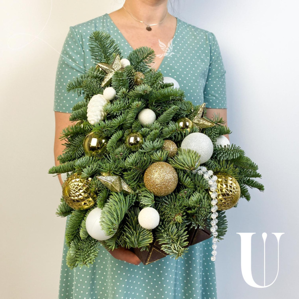 Новогодняя композиция из нобилиса и декора в шляпной коробке