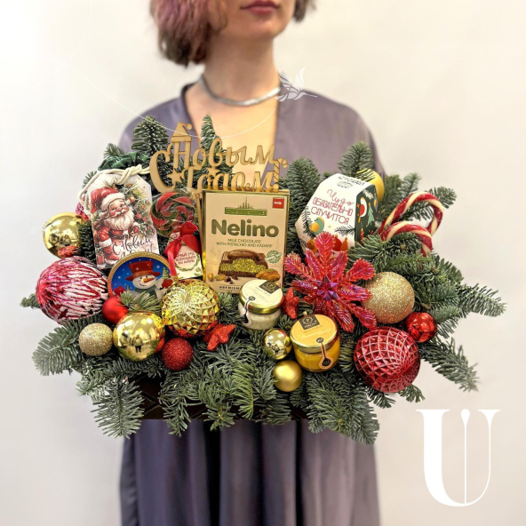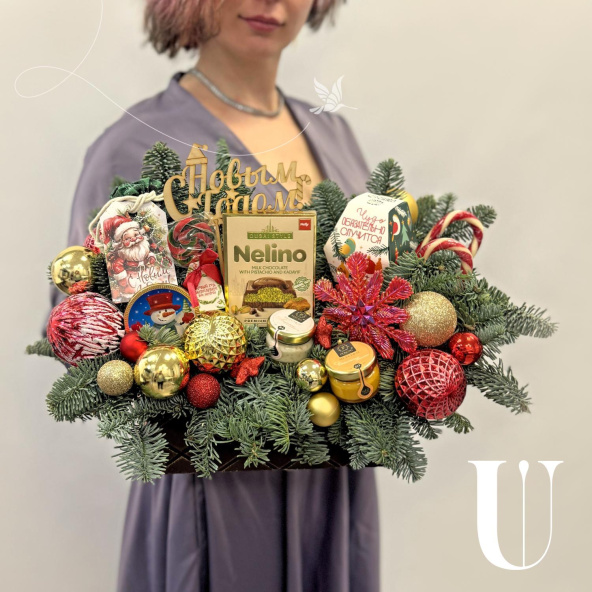 Подарочный набор в деревянном ящике с натуральным нобилисом и новогодним декором: