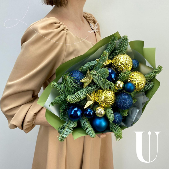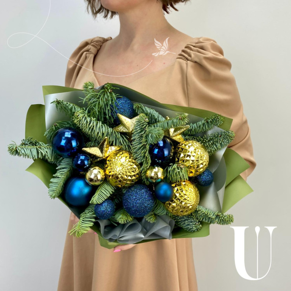 Букет из нобилиса, синих и серебряных игрушек в упаковке