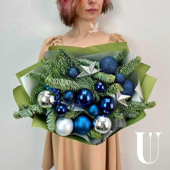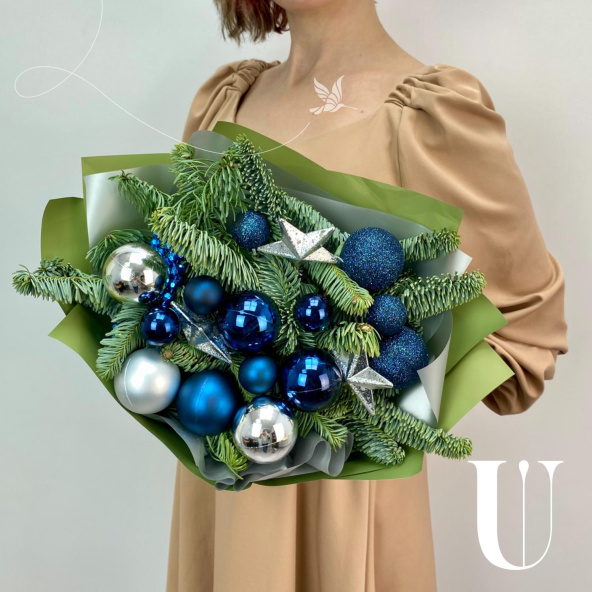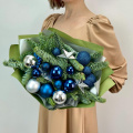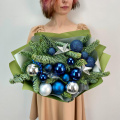 Сине-золотой новогодний букет из нобилиса и игрушек в упаковке