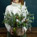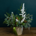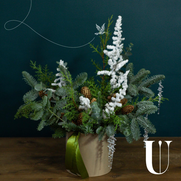 Объёмная зимняя композиция, наполненная ароматом хвои и мягким блеском инея. «Снежная тишина» передаёт ощущение спокойного зимнего утра — когда лес затаил дыхание под пушистым снегом, а хрустальные сосульки ловят первые лучи света.