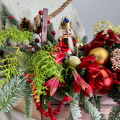 Центром композиции является щелкунчик в окружении новогодних игрушек и красной альстромерии.