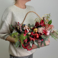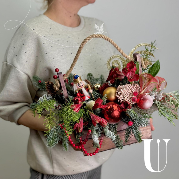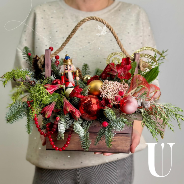 Яркая, праздничная композиция в деревянном ящике с миксом хвойных веточек.