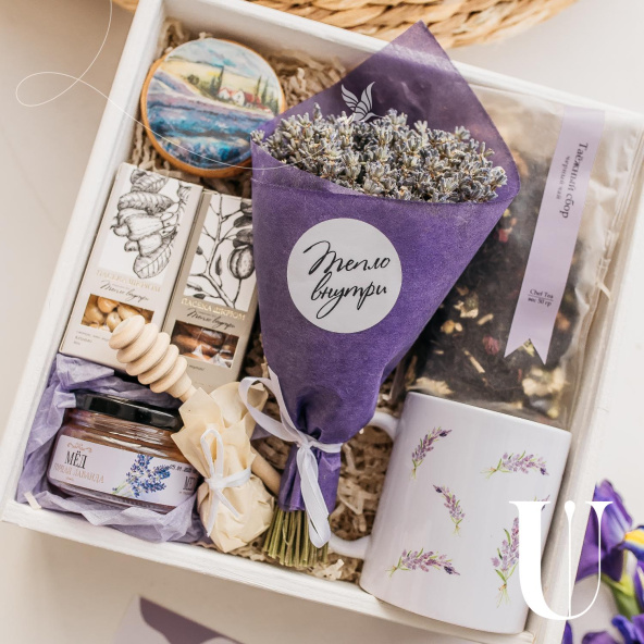 Букет ароматной лаванды не нужно ставить в воду, он будет радовать долгие годы. Ассорти орехов и мед, вкусное и полезное лакомство. Кружка и чай таёжный сбор для самых теплых и уютных посиделок. Пряник ручной работы, кокосовая конфета, деревянная ложка веретено - приятные детали, украшающие подарок. И конечно открытка для самых теплых пожеланий. Это готовый подарок, оформленный в оригинальном деревянном ящике. Создан восхищать!
