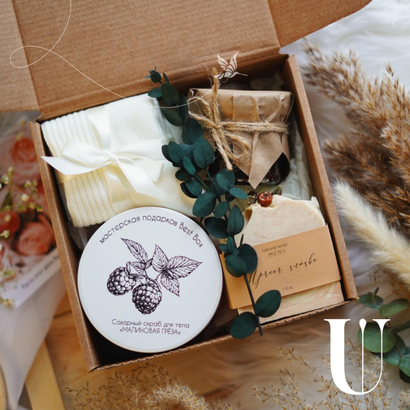 В составе подарочного бокса: сахарный скраб ручной работы "Малиновая греза" (200 гр), хлопковые носочки (36-39 размер), конфитюр малиновый (150 гр), натуральное мыло ручной работы, небольшая открытка.