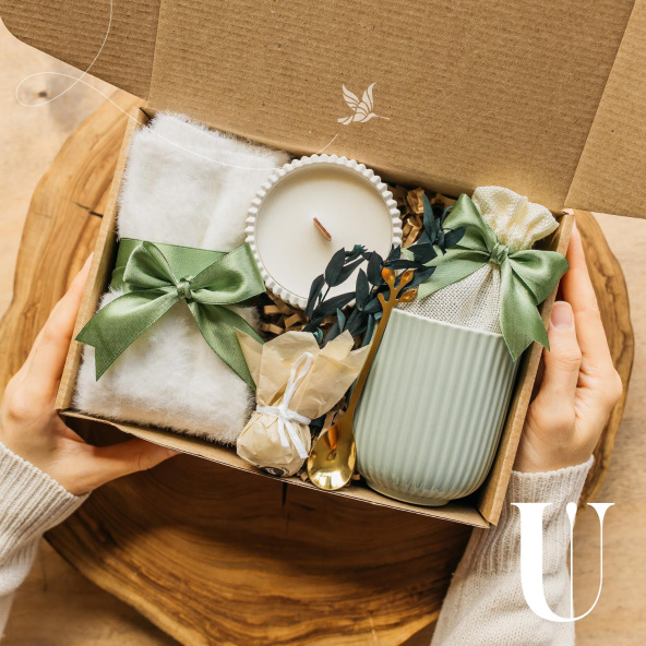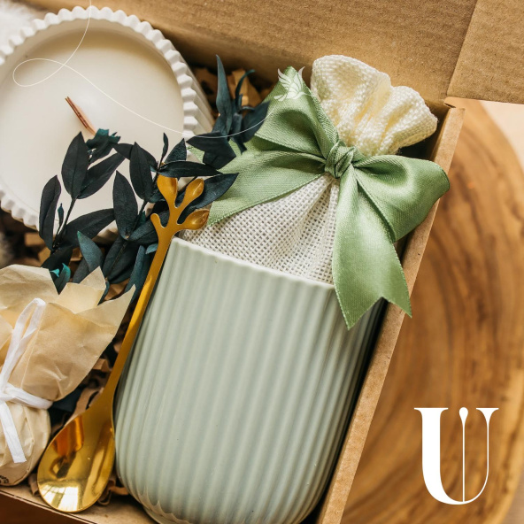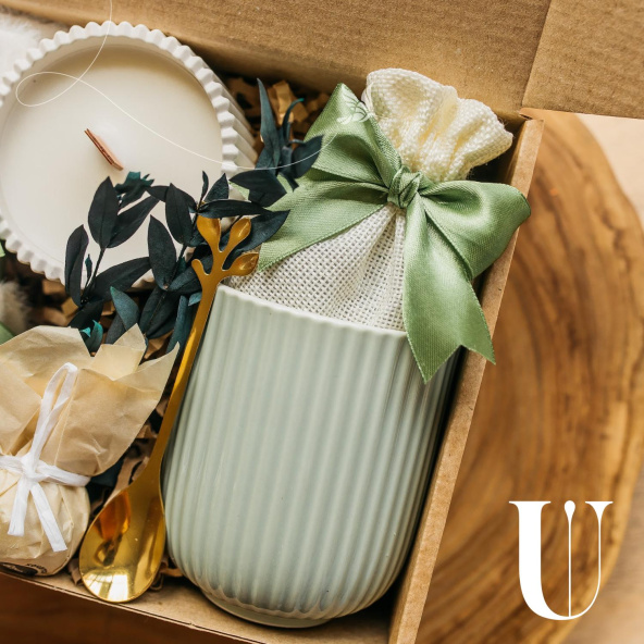 - Утонченный набор в спокойных оттенках зеленого и молочного цвета, созданный для уютных моментов.
