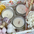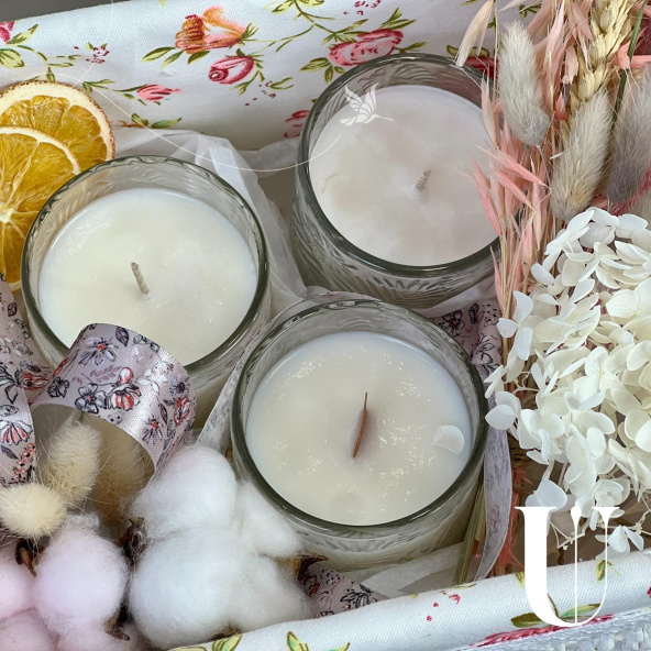 - Ароматические свечи ручной работы из натурального соевого и кокосового воска. Свечи выполнены в стеклянном подсвечнике. Объем свечей 3 по 140 мл;