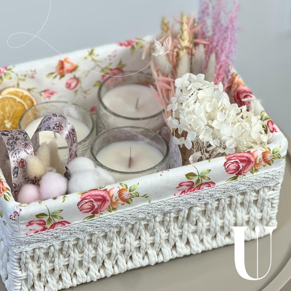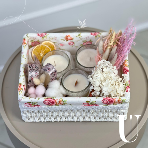 Подарочный набор «Элоди» с ароматическими свечами и сухоцветами в интерьерной корзинке.