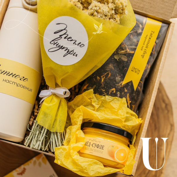 Набор упакован в крафтовую коробочку и перевязан желтой атласной лентой!