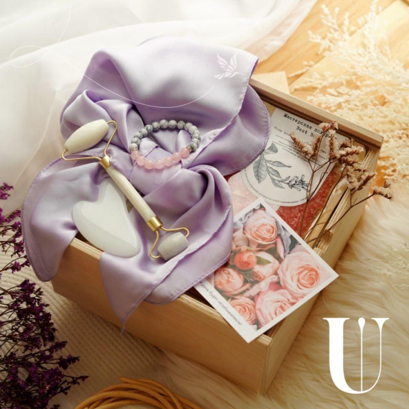 Подарочный набор "Нежность и забота в деревянном боксе с сиреневым платочком"