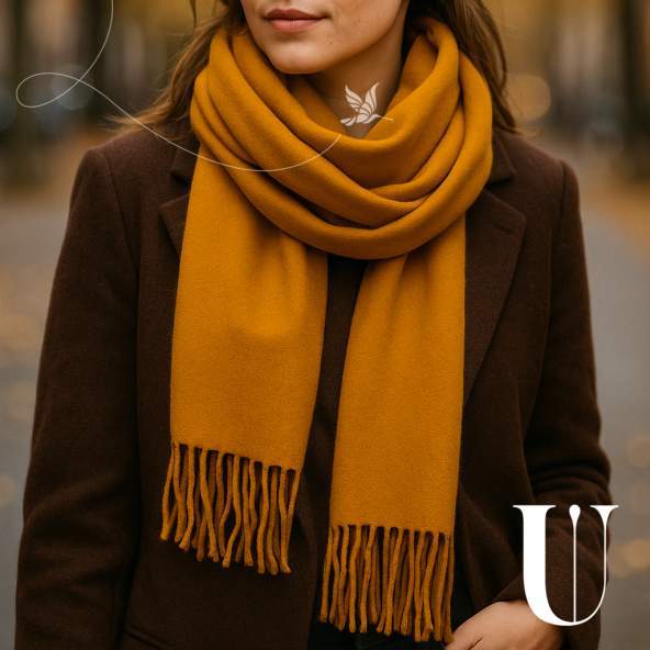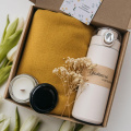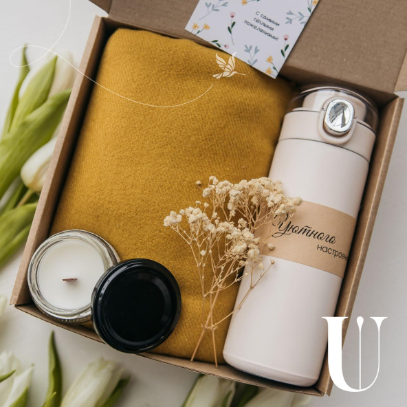 Подарочный набор из женского шарфа, термоса, подсвечника, свечи, арома саше и открытки
