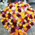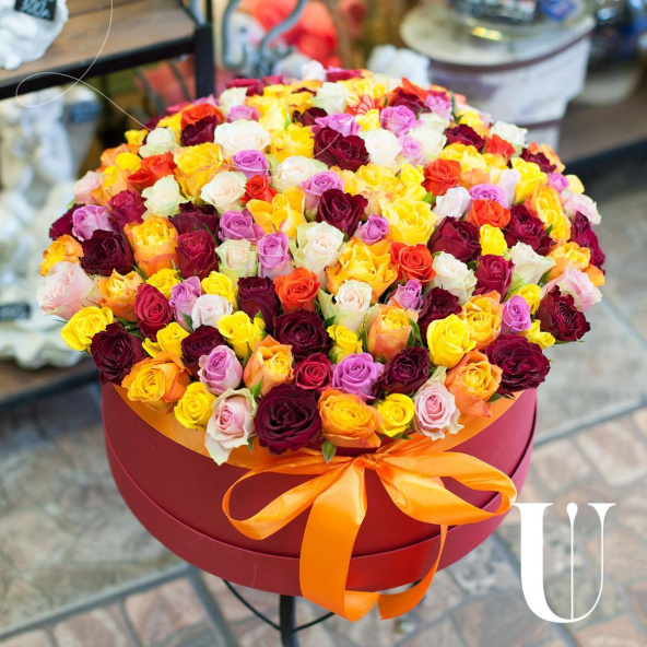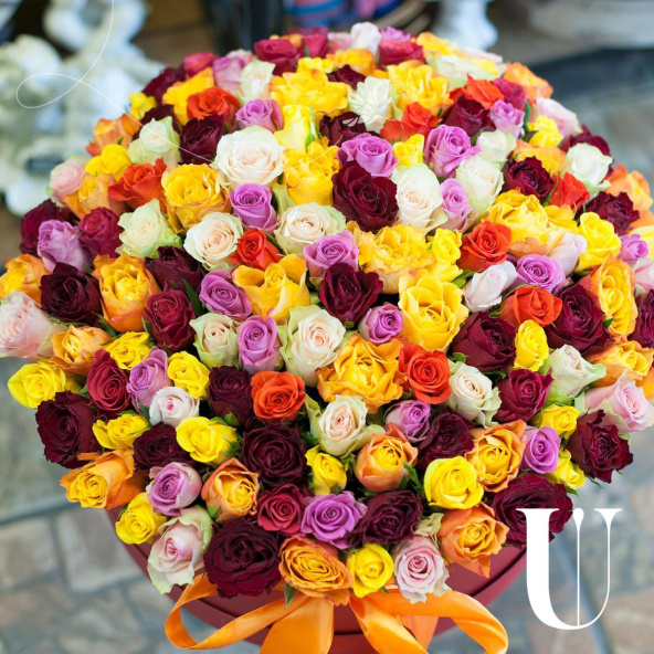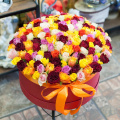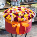Шикарная композиция из розовых орхидей, кустовых роз и белых диантусов в шляпной коробке