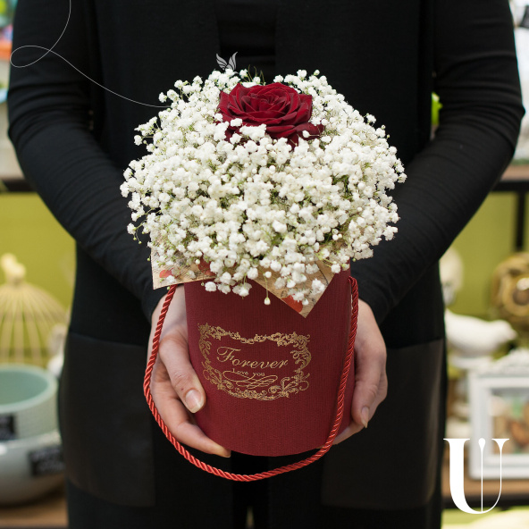 Композиция из белой и розовой гипсофилы в шляпной коробке маджестик